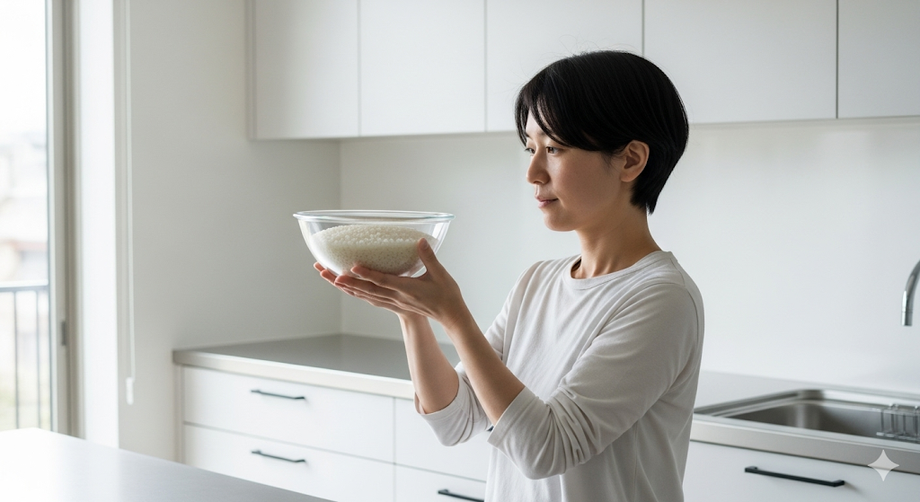 まず、無洗米を計量する際は、正確に計量することが大切です。普通米用の計量カップ(1合=180ml)は、精米時に発生する肌ヌカの体積を考慮して設計されています。そのため、無洗米を普通米のカップで量ると、前述の通り正味の米が多くなってしまいます。専用のカップがない場合は、普通米用のカップで測った後、炊飯器の無洗米コースの目盛りに合わせ、普通米で炊く時よりも大さじ1〜2杯(約15ml〜30ml)程度の水を足すなど、意識的な調整を試みてください。この調整は、肌ヌカの隙間がなくなった分の容積差を埋めるために必要となります。