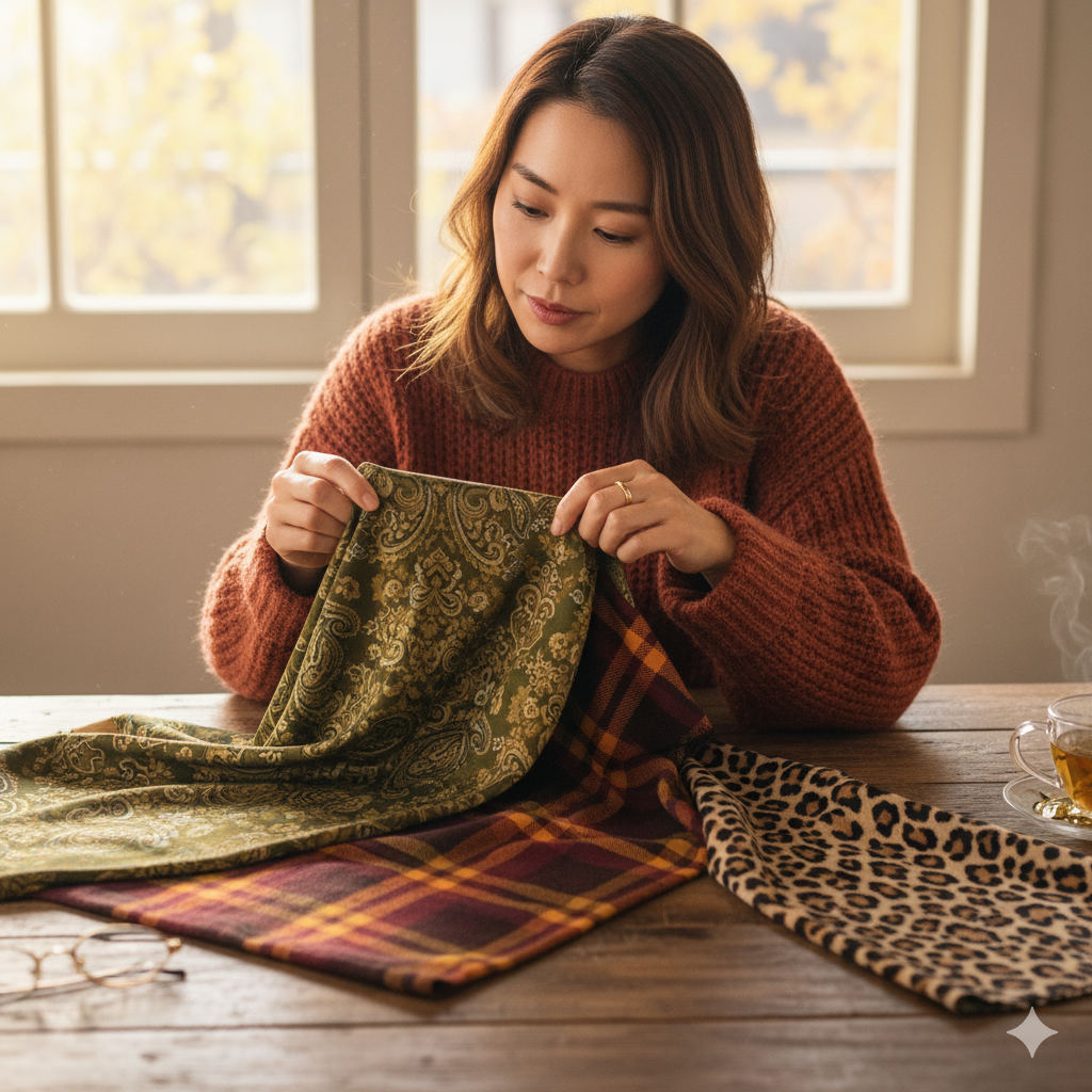 - 得意な柄: ペイズリー、ボタニカル柄、アニマル柄(レオパードなど)、大きめのチェック柄(タータンチェックなど)、エスニック柄
